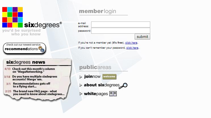 Longtemps avant Facebook, MySpace, Friendster, il y avait SixDegrees.com, premier réseau social dont le nom fait référence à la théorie des 6 degrés de séparation liant tous les personnes au monde.